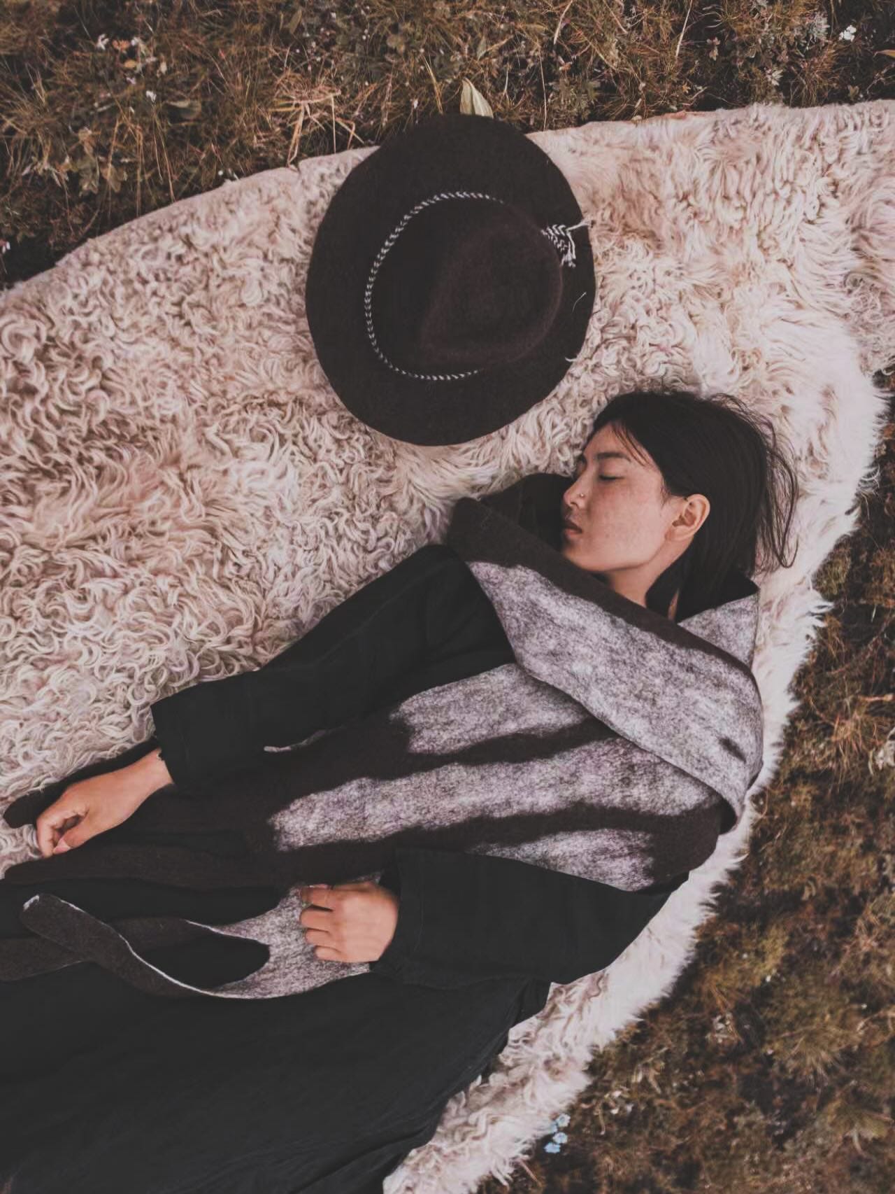 Felt is one of the oldest fabrics, made without needle or thread—just hands kneading wool and yak down until fibers bind. The best wool comes from two-year-old sheep in autumn, dampened, rolled, and kneaded hundreds of times to become tight and resilient. Today, nomads continue this craft, sending their warmth across the world.