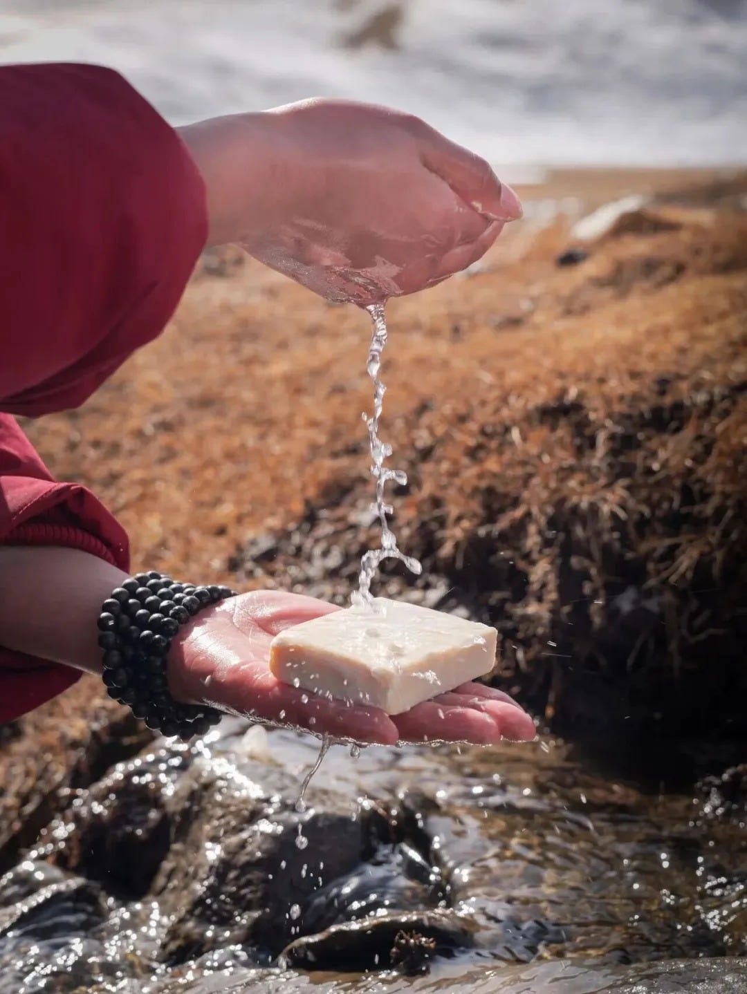 A pure gift from the plateau. We use yak butter—Tibet's “soft gold”—with plant oils, gently crafted over 40 days through natural saponification. Inspired by the snow leopard's spots and the softness of yak milk, each bar is shaped by hand. It carries the warmth of the earth and those who tend it.