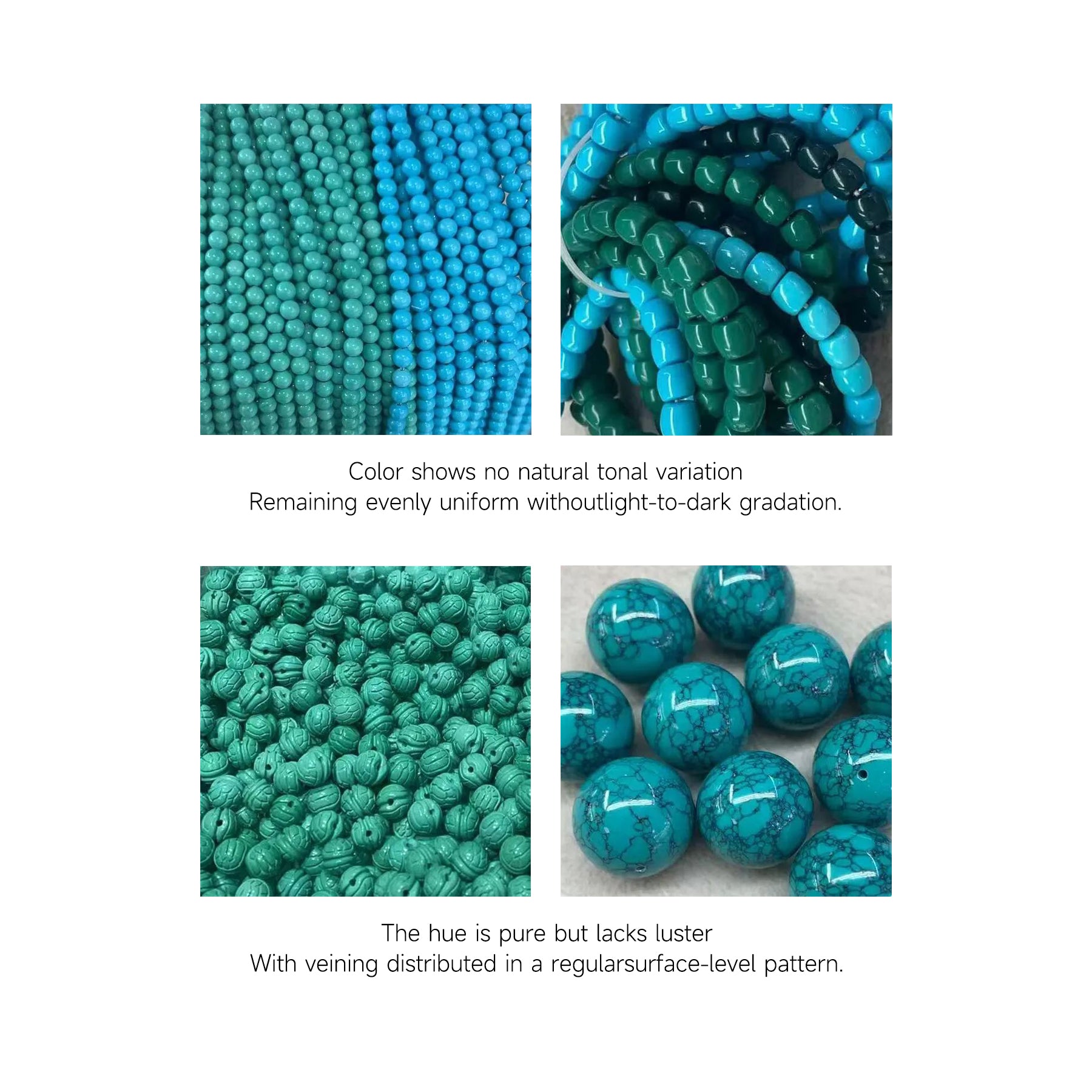 1. Color and Texture: Natural turquoise shows organic color variations and irregular veins, while treated or imitation stones appear overly uniform and unnaturally bright.